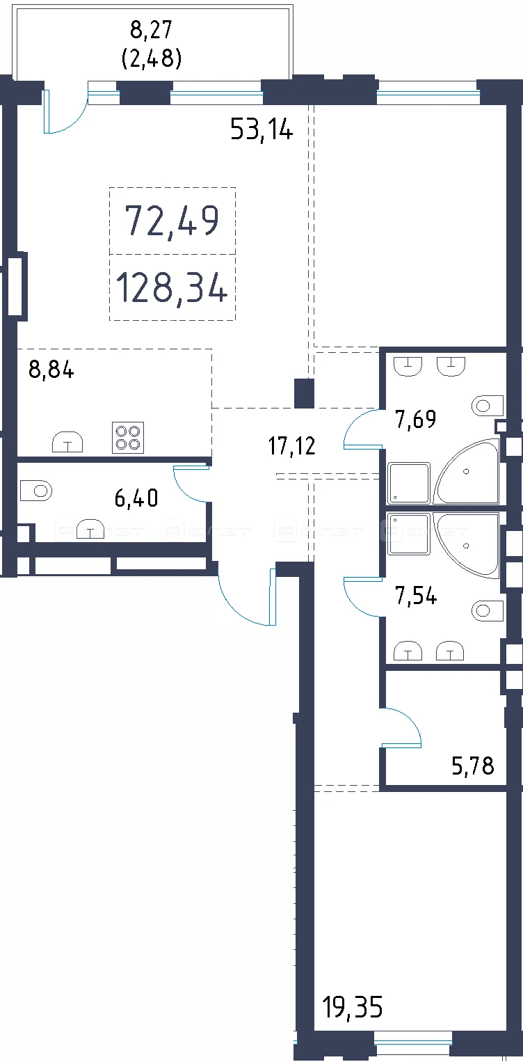 - 128.34/72.49/8.84 м²
